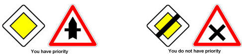 Priorité à Droite (give priority to traffic coming from the right) is an old rule which may still apply at some junctions. If you see the yellow diamond with a white border sign then Priorité à Droite does not apply to the road ahead. Although many drivers now realise it's dangerous to pull straight out into a road of oncoming traffic, keep your eyes peeled for vehicles appearing from the right. The rule is usually indicated as you enter or leave an area: